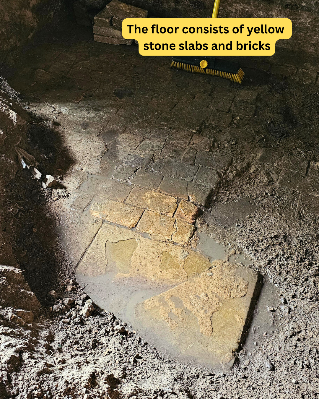 A little cleaning with water showed the slab was a golden colour of what looks like a sandstone. The bricks turned out to be pavers, 40mm deep made of a yellow material flecked with red very similar to the ‘London Stock’ type of brick made from ‘brickearth’ clay which has a deposit in Stoney Hills Ware.