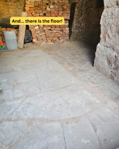 While cleaning the rubble and debris from the tower on 7th Sept came a star find. As we started clearing the last of the loose soil from the West side of the tower we found at the same height as the packed earth surface, the corner of a stone slab, and then a few feet later what looked like a brick floor.
